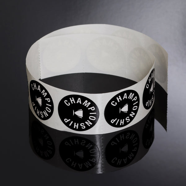 Professional Look: Solid black circle with “Championship” lettering and trophy-cup logo in the center - Self-Adhesive Backing: Easy to apply — peel and stick; no tools or glue required