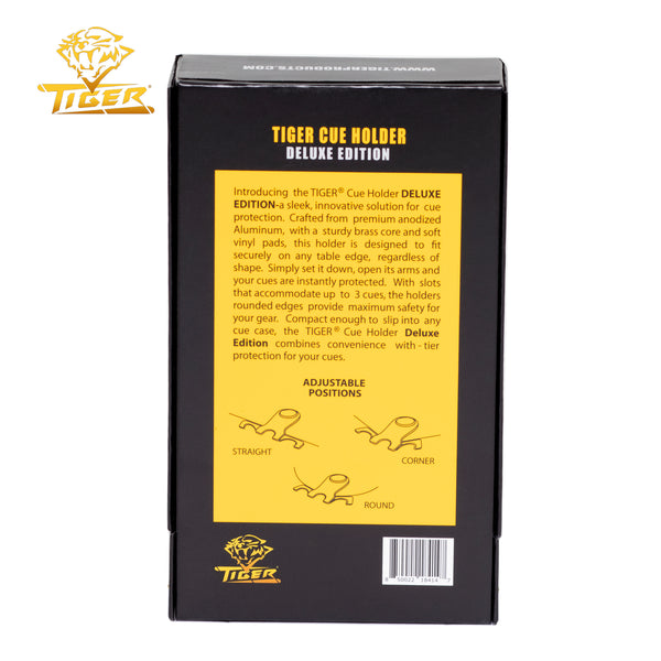 Finished in black with a contrasting brass accent and official Tiger branding, the Tiger Cue Holder Deluxe Edition combines modern style with practical functionality for serious billiard players.