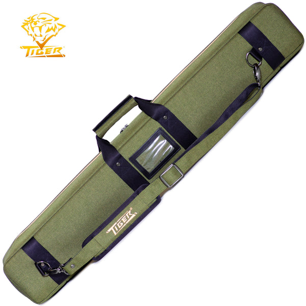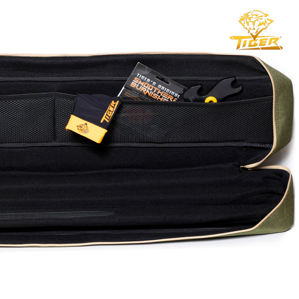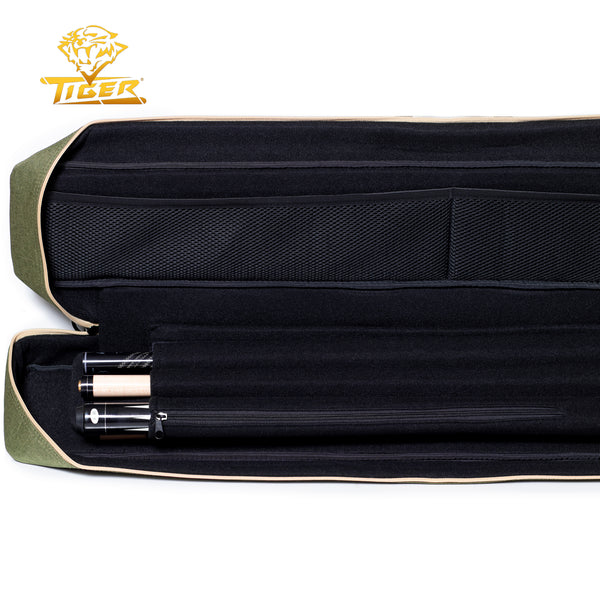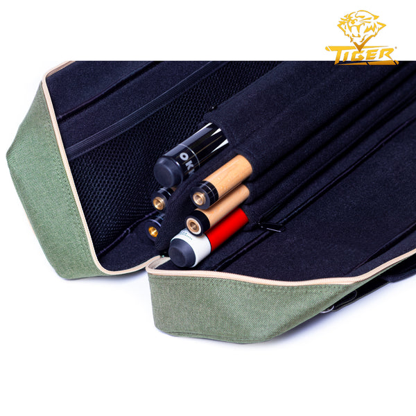 The Tiger Vintage Cue Case is an instant classic — blending timeless style with Tiger’s trademark innovation. Crafted in muted green canvas with cream vinyl accents, this butterfly-style soft case offers a perfect mix of aesthetics, practicality, and protection. Designed for players who value elegance and function, it provides room for two butts and two shafts, with multiple pockets to organize all your accessories